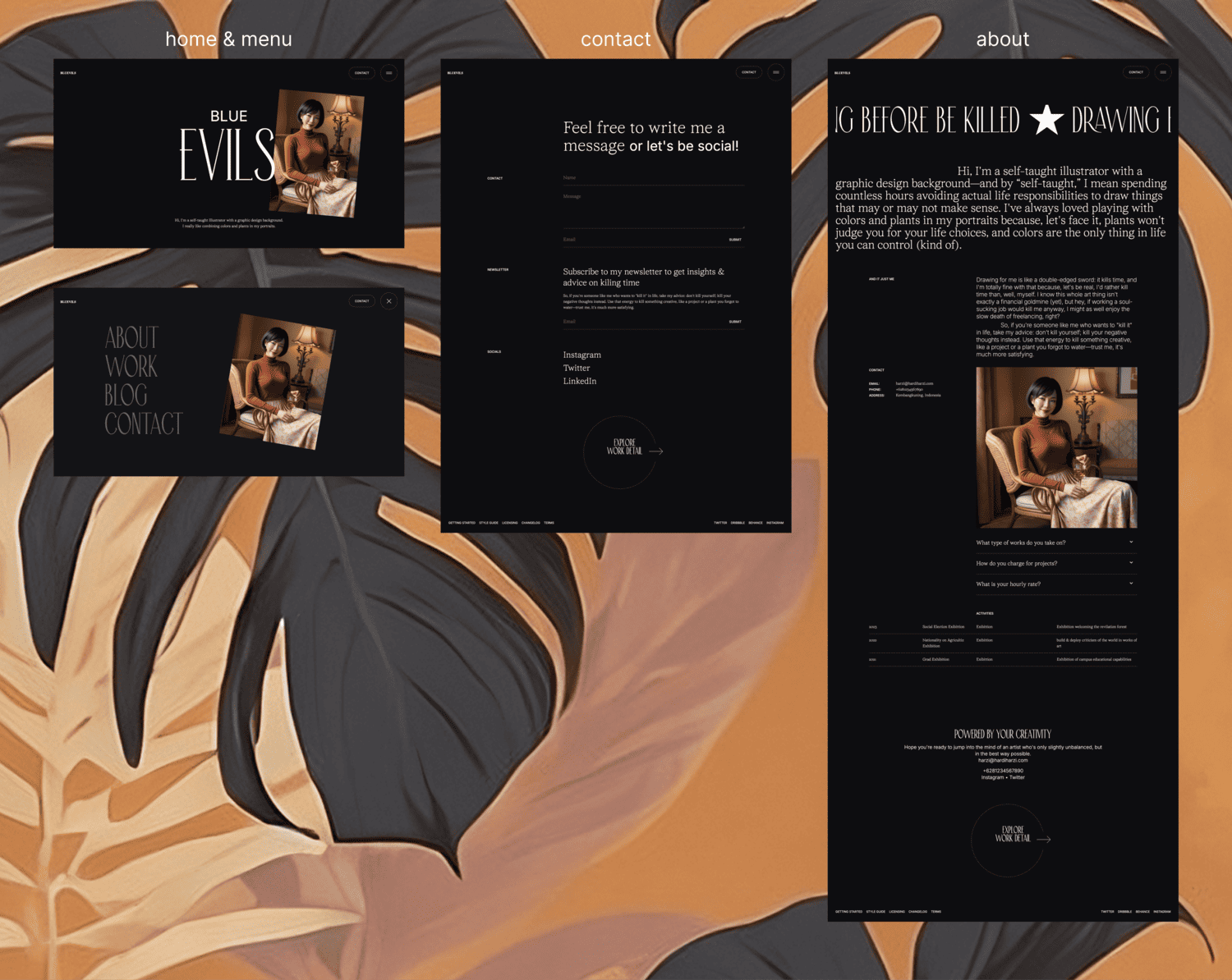 offer all the dark ambient and make the artwork to be the main focus, for delighting the viewers with the beautiful illustration. interaction on work page bold the intention the art work is the main stars on this website.