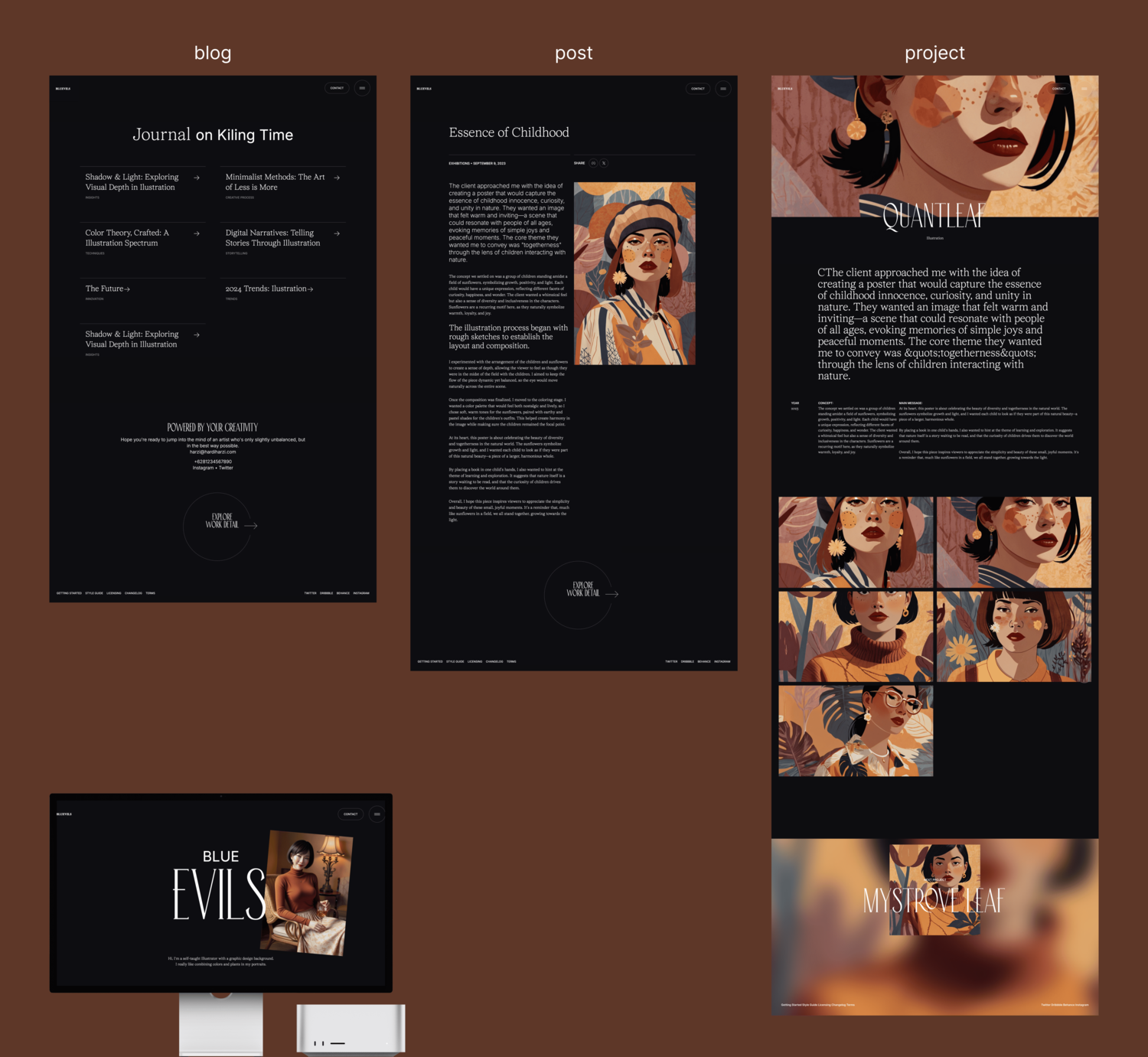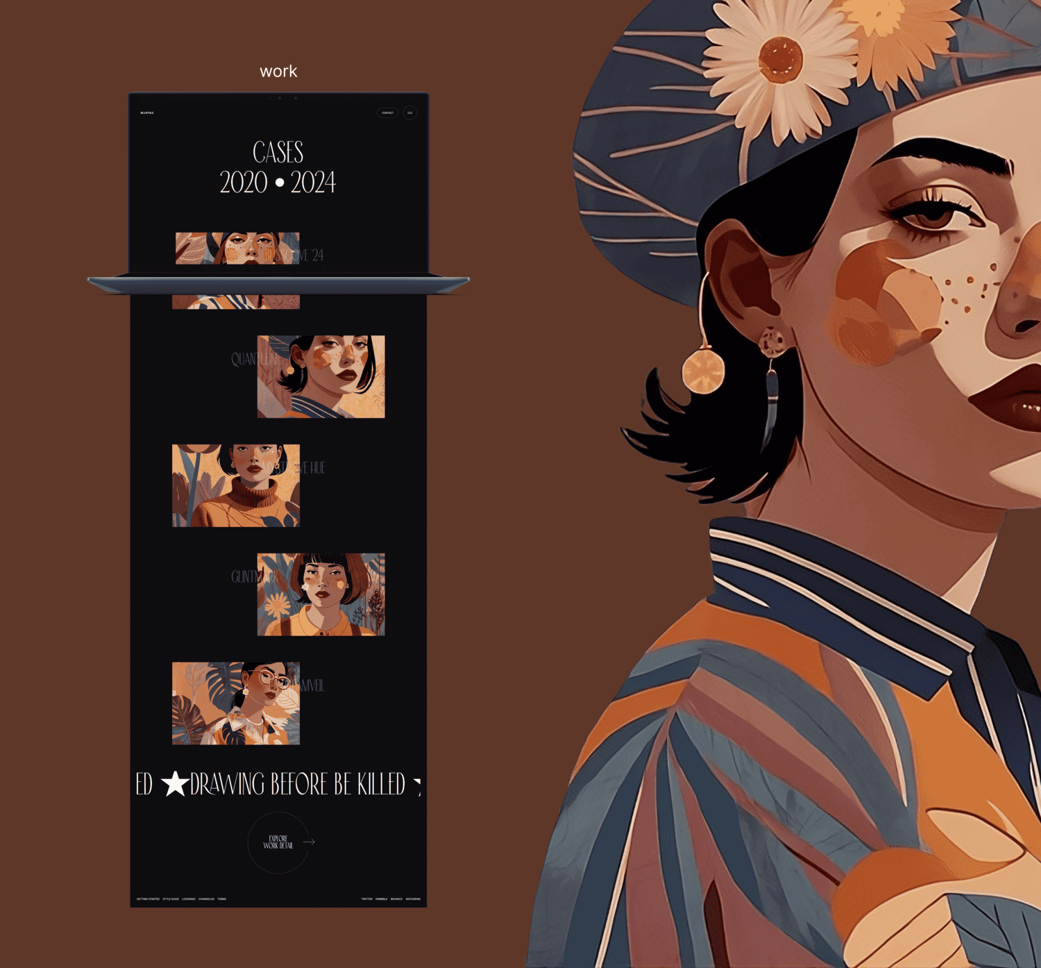 offer all the dark ambient and make the artwork to be the main focus, for delighting the viewers with the beautiful illustration. interaction on work page bold the intention the art work is the main stars on this website.