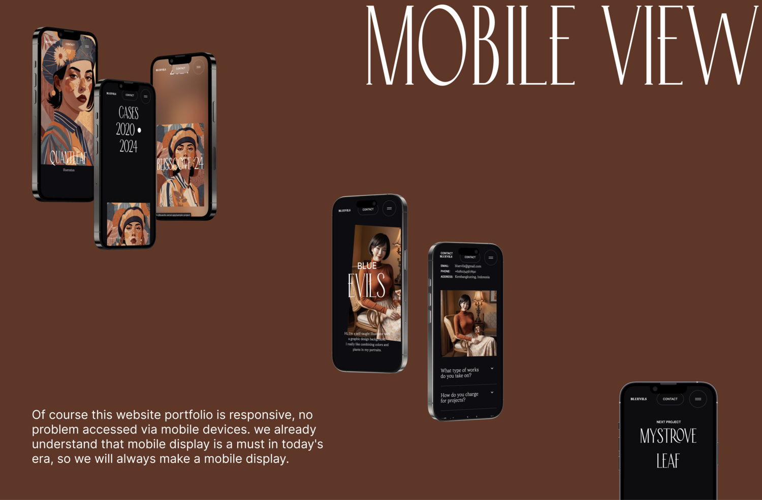 For home page We use 1 full screen style layout that have animation slide up potrait and text. focusing on the BLUEVILS personality that calm and beautiful. picturing the enviroment she lives in.
